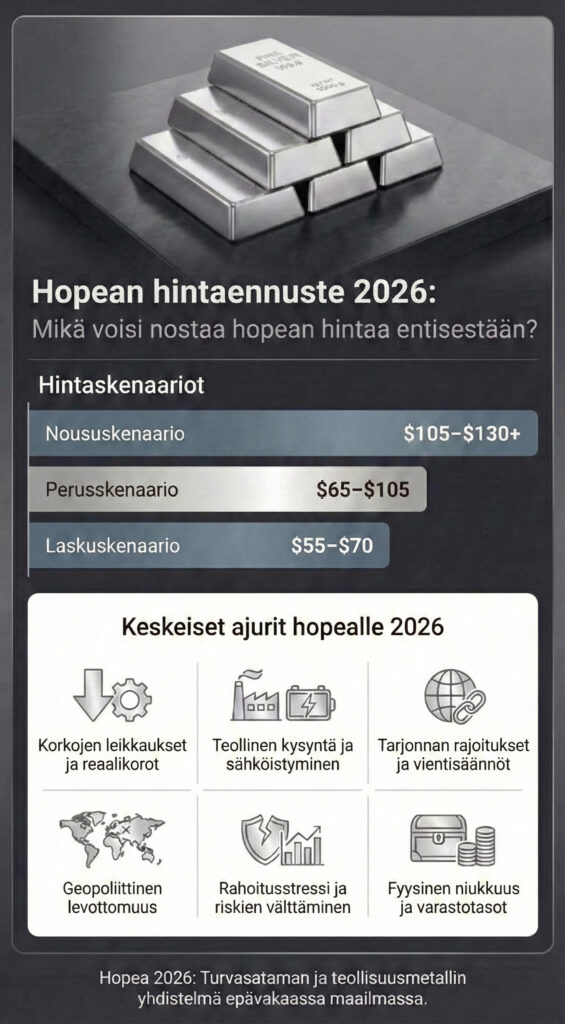 Hopea menestyy parhaiten silloin, kun rahapoliittiset tekijät sekä teollinen kysyntä tai tarjontadynamiikka kehittyvät suotuisasti yhtä aikaa. Keskeisiä seurattavia tekijöitä ovat: